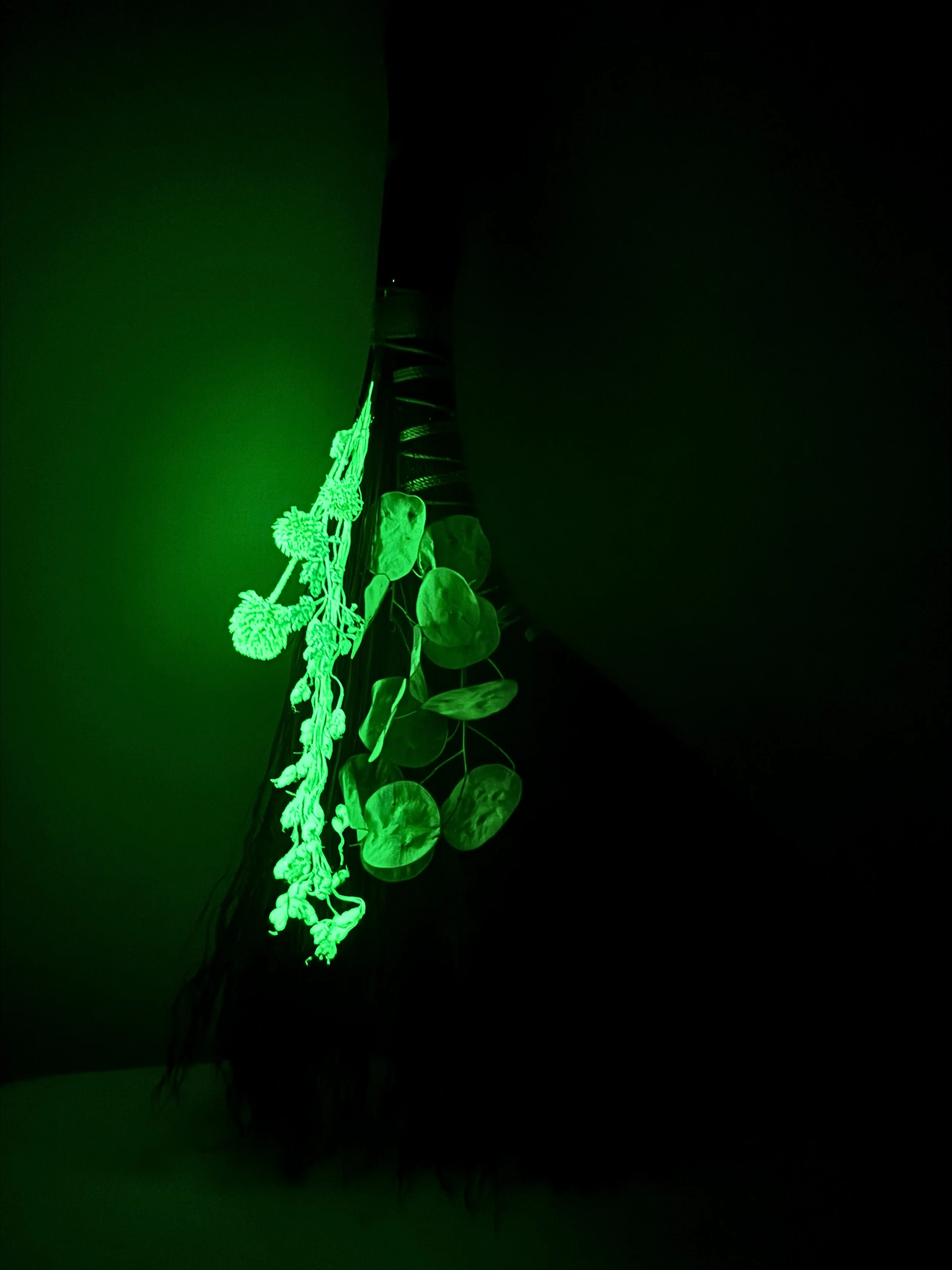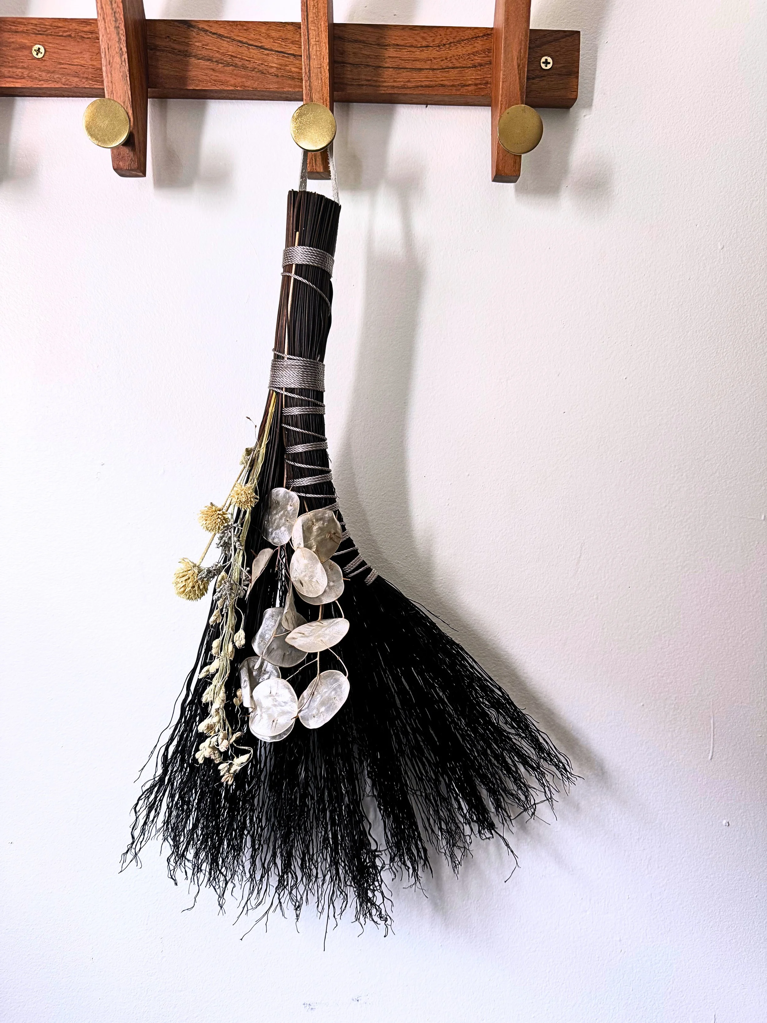 Above | Firefly Broom dyed broomcorn, nylon twine, found silver dollar plant, and botanicals specially treated to glow in the dark: gomphrena from the farmer’s market, seeded broomcorn I grew. 2024.