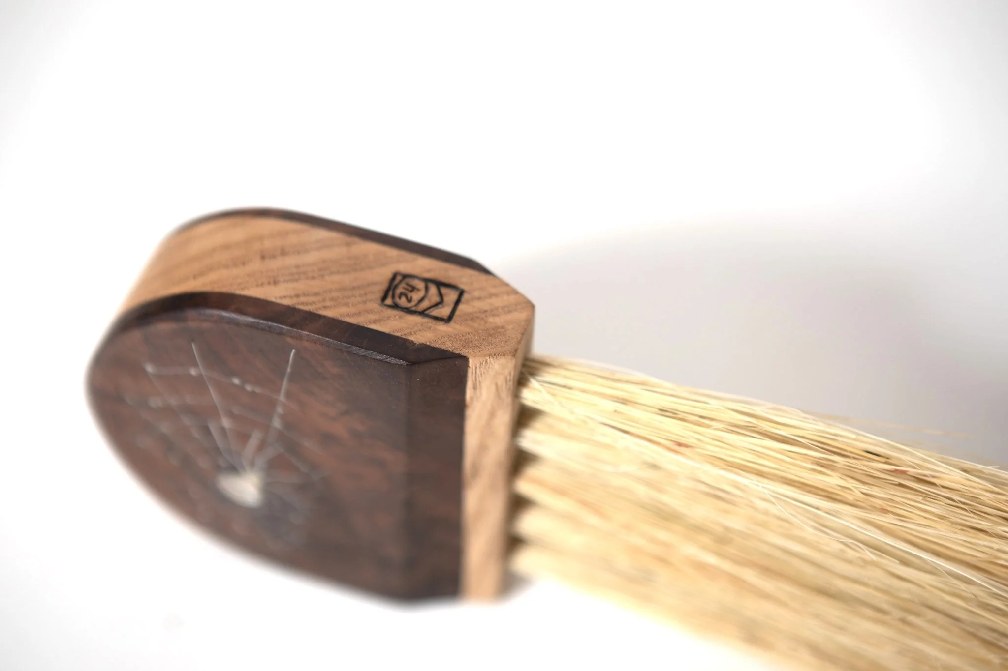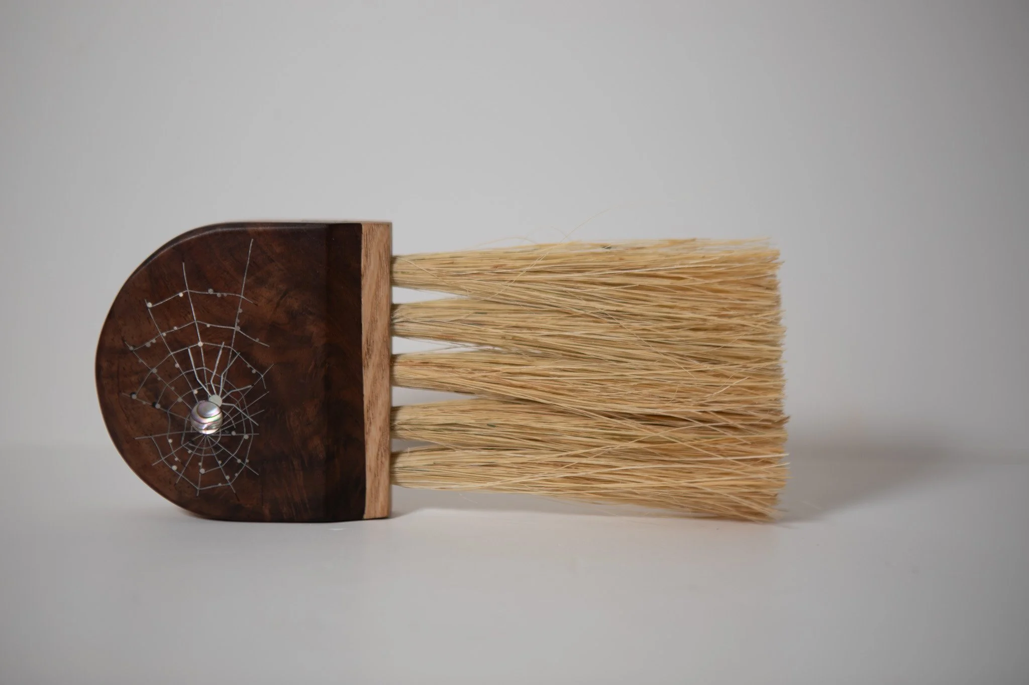 Above & Right | Spiderweb Brush reclaimed walnut and red oak, recycled tin can, silver wire, abalone shell, CA glue, natural ixtle/agave/tampico fiber. The backside has a woodburned fly hiding in the walnut grain, but the pictures I took of it ended up being just slightly unfocused, unfortunately. 2024.