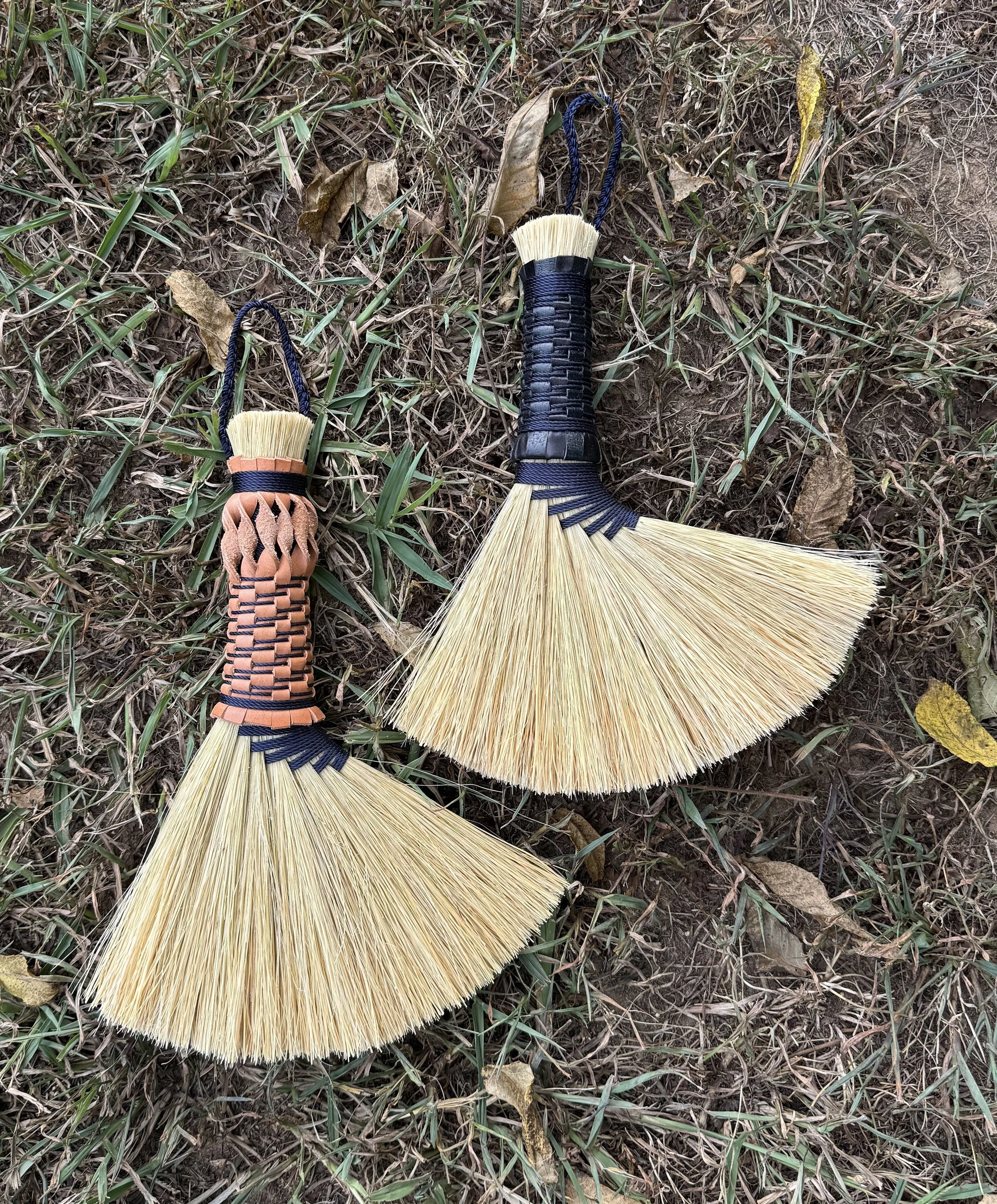 Left | Seeded Hen’s Wing with Folkschool Broomcorn natural broomcorn, nylon twine, reclaimed leather hanger, hand harvested sorghum Bicolor seedheads added decoratively to the body of the broom and stalk woven into the handle. 2024.